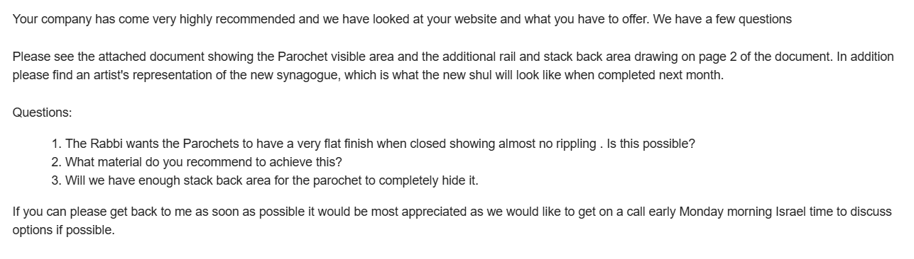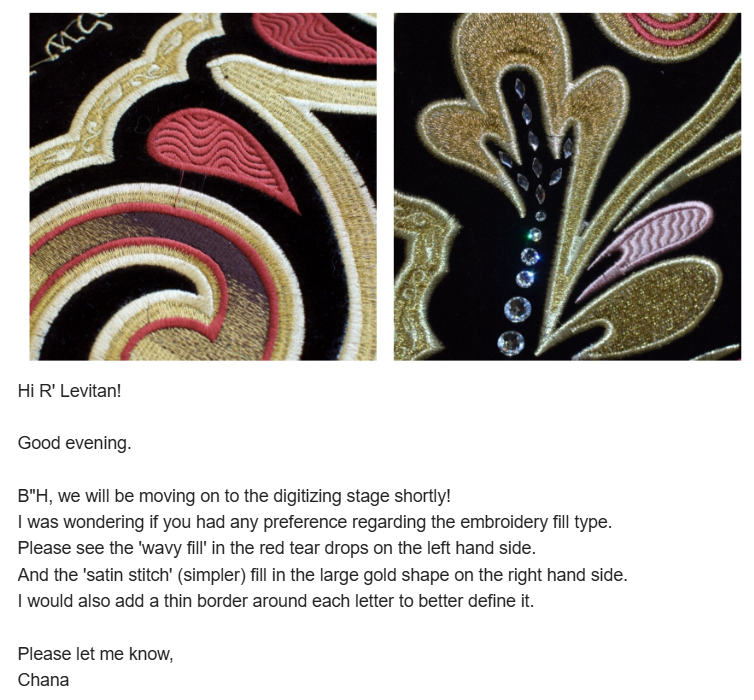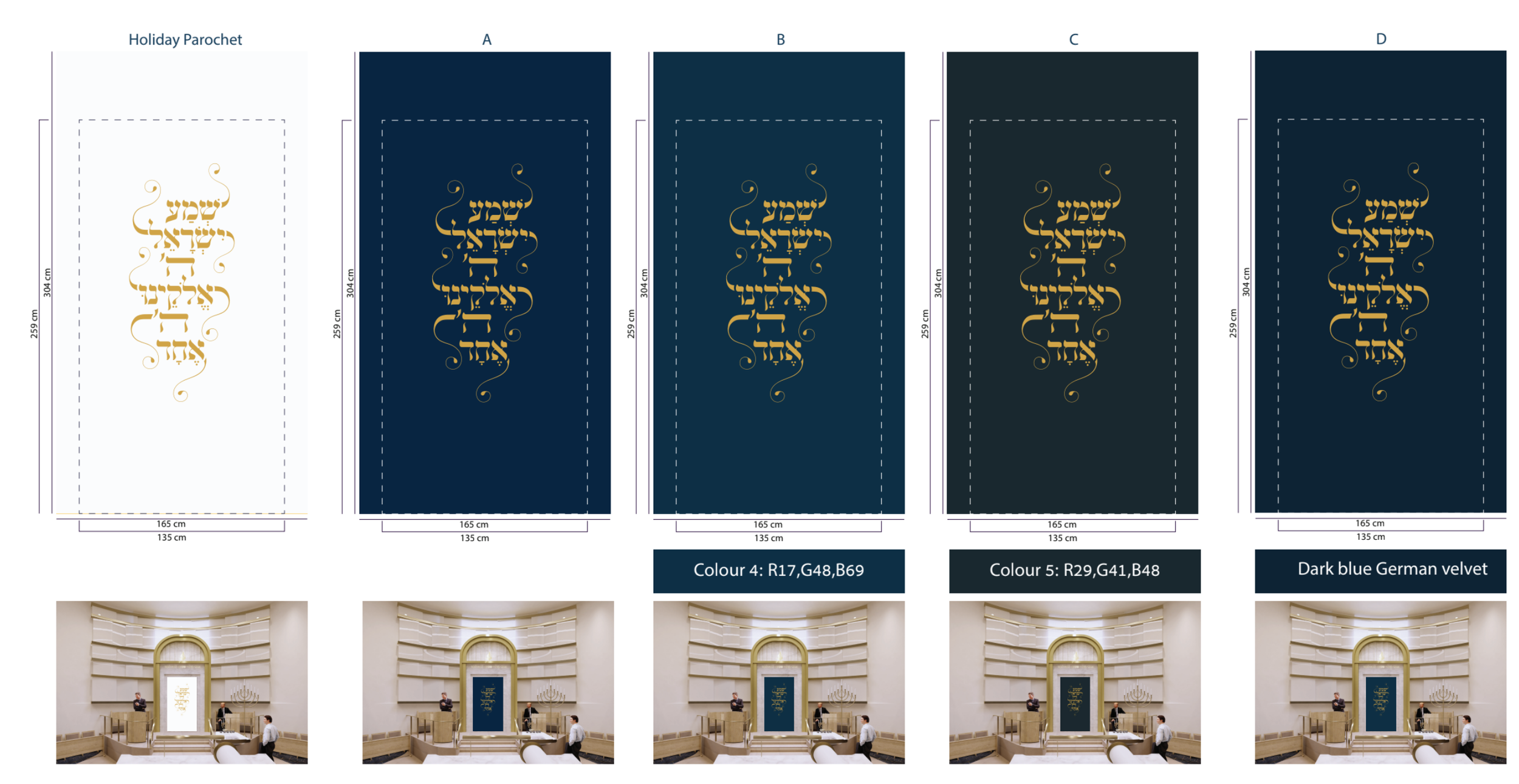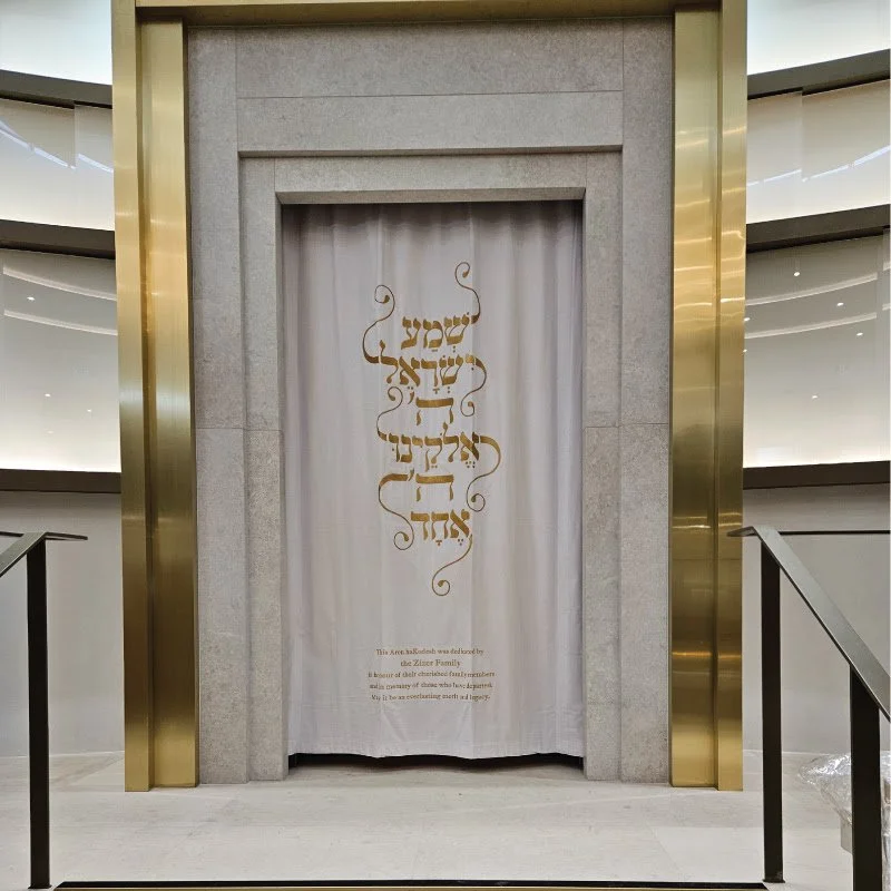 We had a Zoom with them to discuss ideas. They wanted two coordinating parochets, one for the year and a special one for the high holidays. It also needed to fit on a special hanging system that they had installed, which was a very important detail for them.