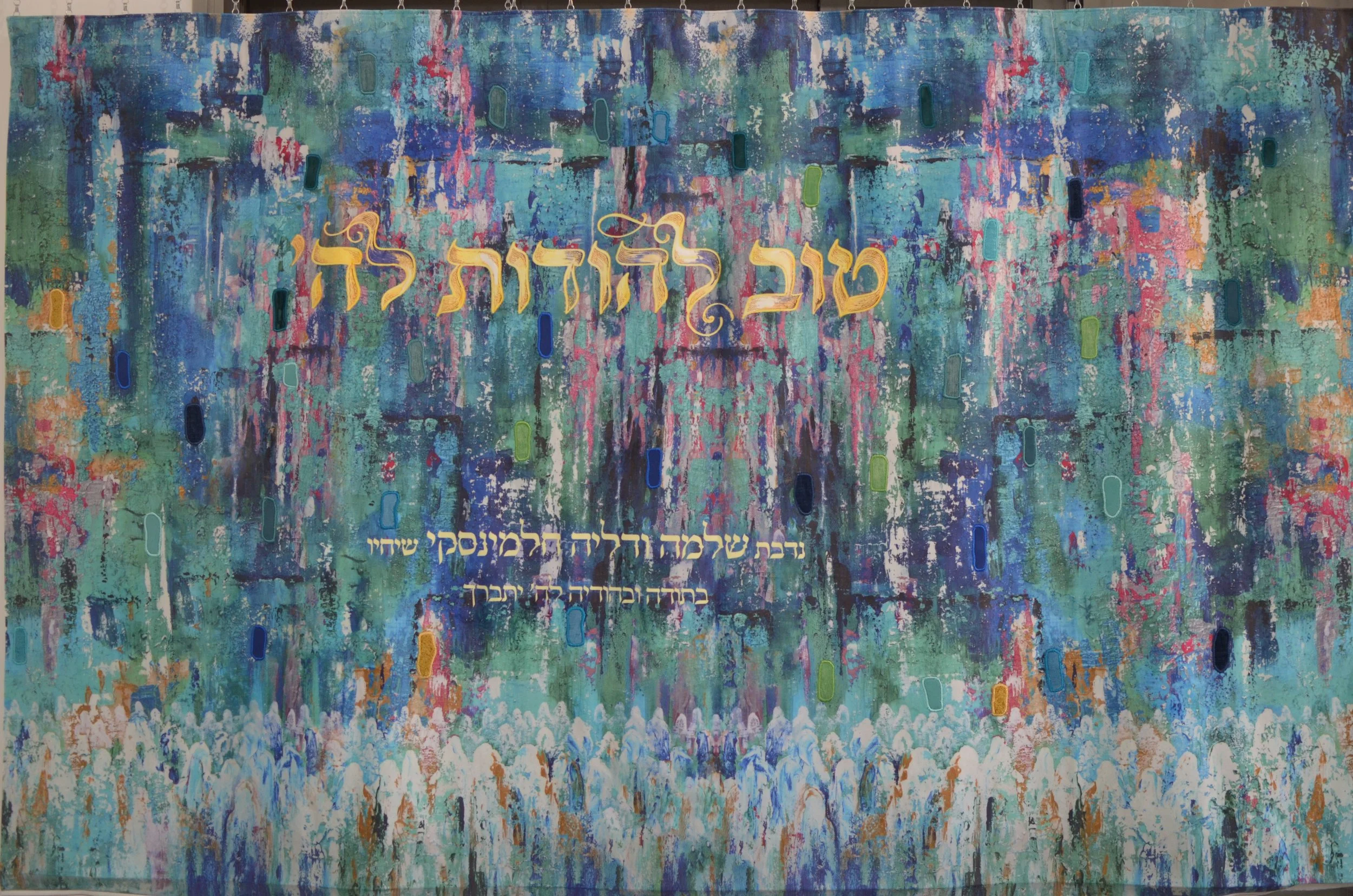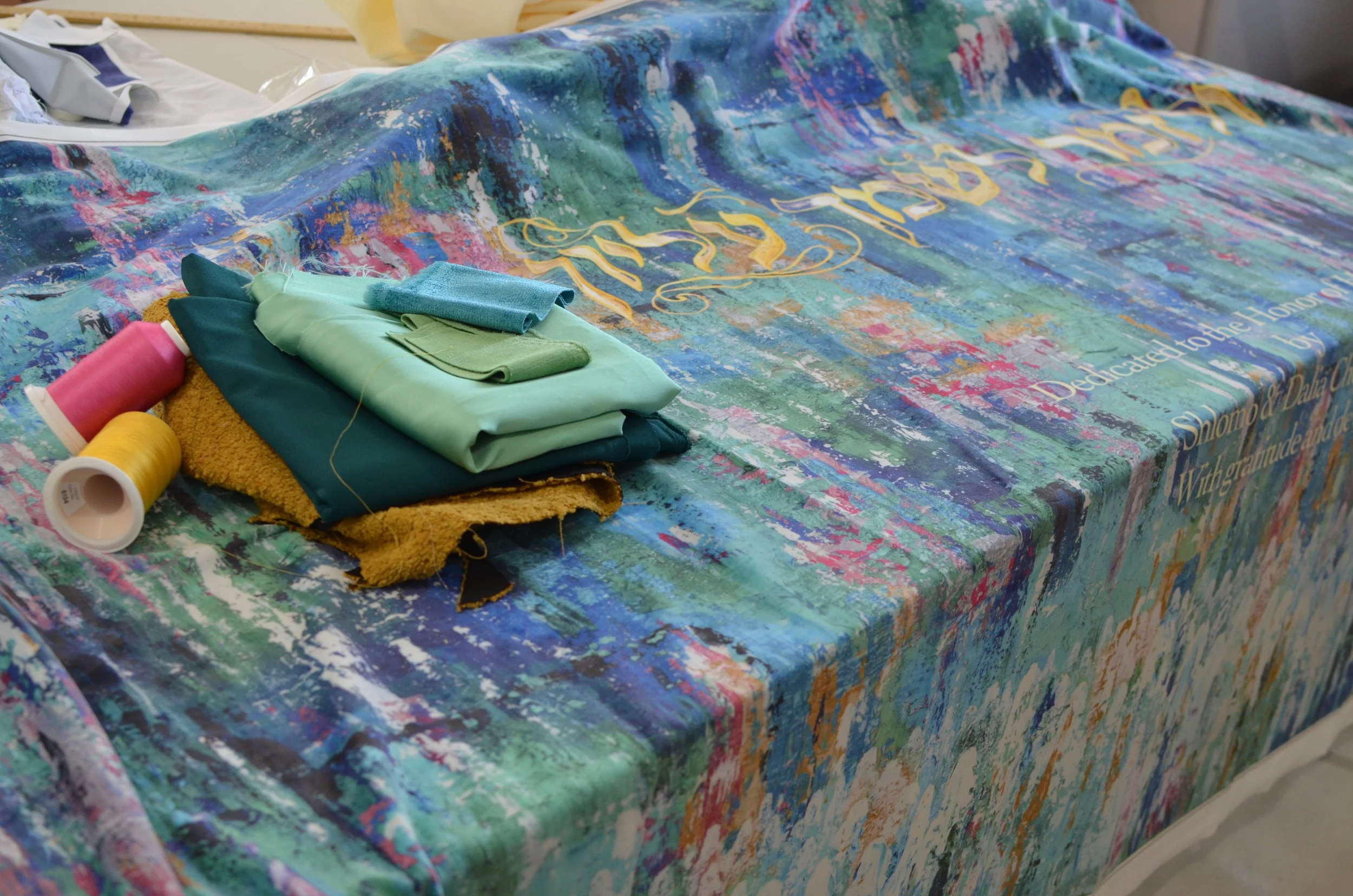 The finished parochet was breathtaking. The combination of Menucha Yankelevitch’s painting, the Hebrew typography, and our textured appliqué created a piece that was simultaneously modern, meaningful, and deeply inspiring. The community’s response was overwhelmingly positive, and Eduardo shared how thrilled everyone was with the result.