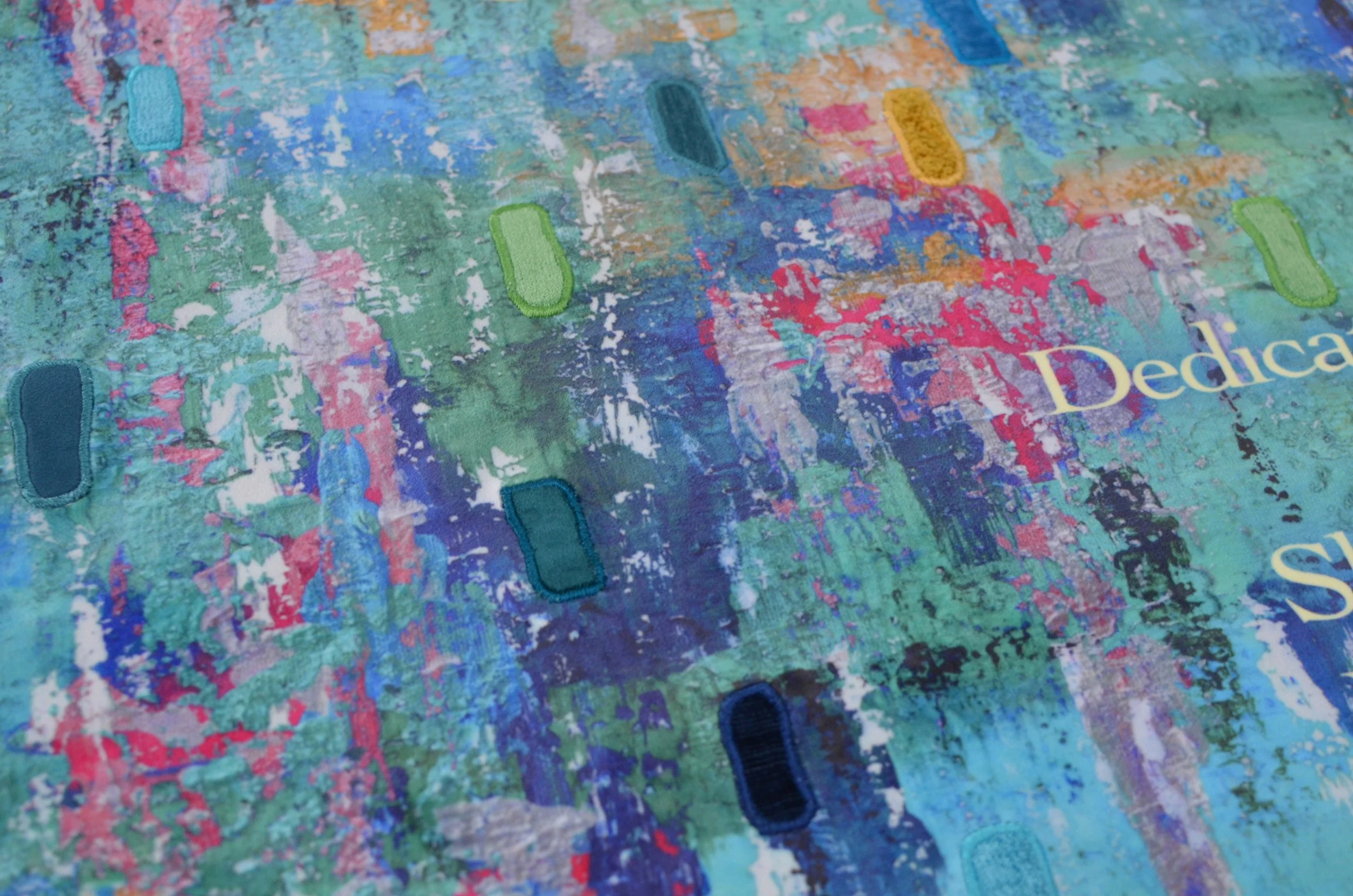 Once the fabric was chosen, we printed the full-scale artwork and our talented embroideress added appliqué “Kotel stones” in a range of colors, textures, and sheens. Additional hand embroidery highlighted key elements, adding dimension and emphasizing Menucha’s artwork in a tactile, visually rich way.