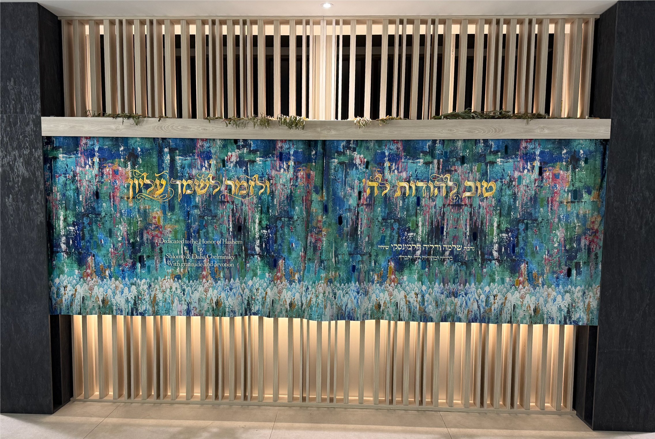 Once we confirmed dimensions, we began experimenting with design options. We used Menucha Yankelevitch’s original painting, Standing at the Kotel in Turquoise, and transformed it into a “landscape repeat” to fit the unusually wide Aron HaKodesh. Eduardo requested that we add Hebrew typography layered over the artwork, and after a few revisions, we landed on a harmonious design that balanced the painting with the text.
